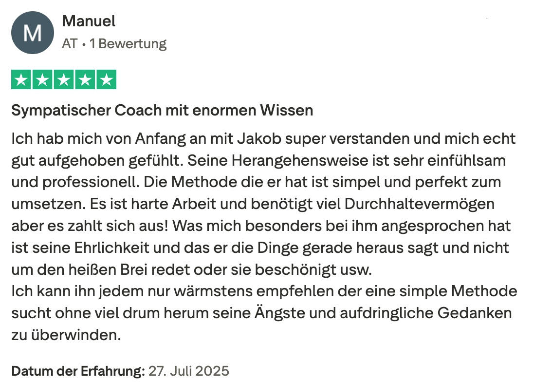 machten mir schwer zu schaffen.Nach 5 Psychotherapien, etlichen Coachings und jede erdenkliche Entspannungsübung, war ich immer noch am gleichen Punkt wie vorher - mehr oder weniger. Ich habe mich immer gefragt, warum mir keiner sagen kann, wie ich meine Ängste überwinden kann.Also musste ich mich selbst über 3 Jahre intensiv mit diesem Thema beschäftigen und habe es eher später als früher endlich geschafft. Ich finde, es gibt viel zu viele Methoden und Strategien, die nicht funktionieren können, wenn man sie einmal näher betrachtet.Aus diesem Grund habe ich es mir zur Aufgabe gemacht, anderen diesen unnötig langen Weg zu ersparen. Stattdessen will ich ihnen einen Weg aus der Angst zeigen, der bewährtermaßen funktioniert, wenn man am Ball bleibt.
