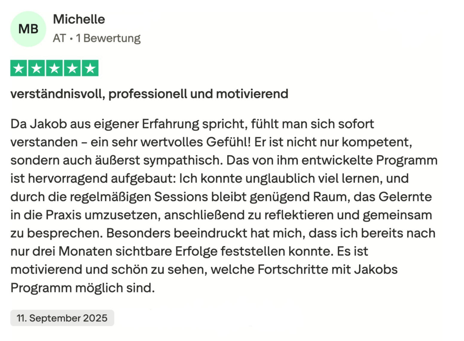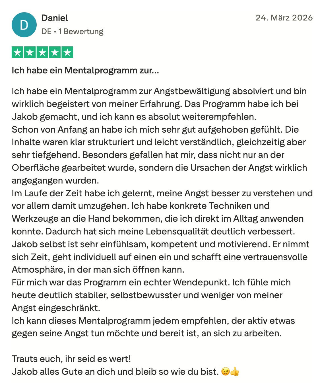 Dieses Programm ist ein Mentaltraining und keine Therapie oder medizinische Behandlung. Es ersetzt keine ärztliche oder psychotherapeutische Betreuung. Falls du unter schweren psychischen Belastungen leidest, sprich bitte vorher mit einem Arzt oder Therapeuten.