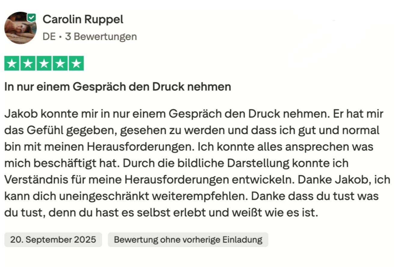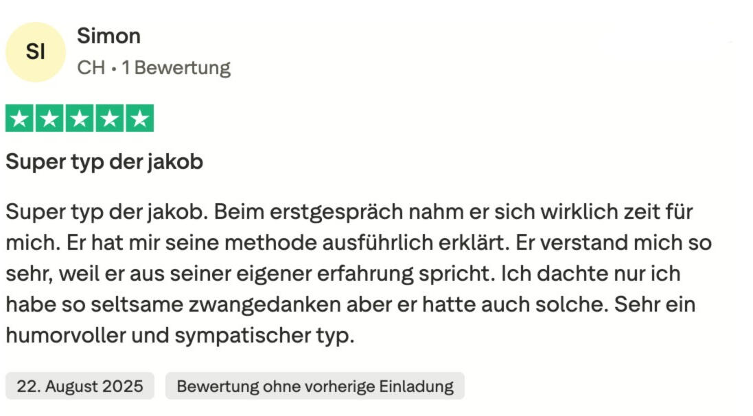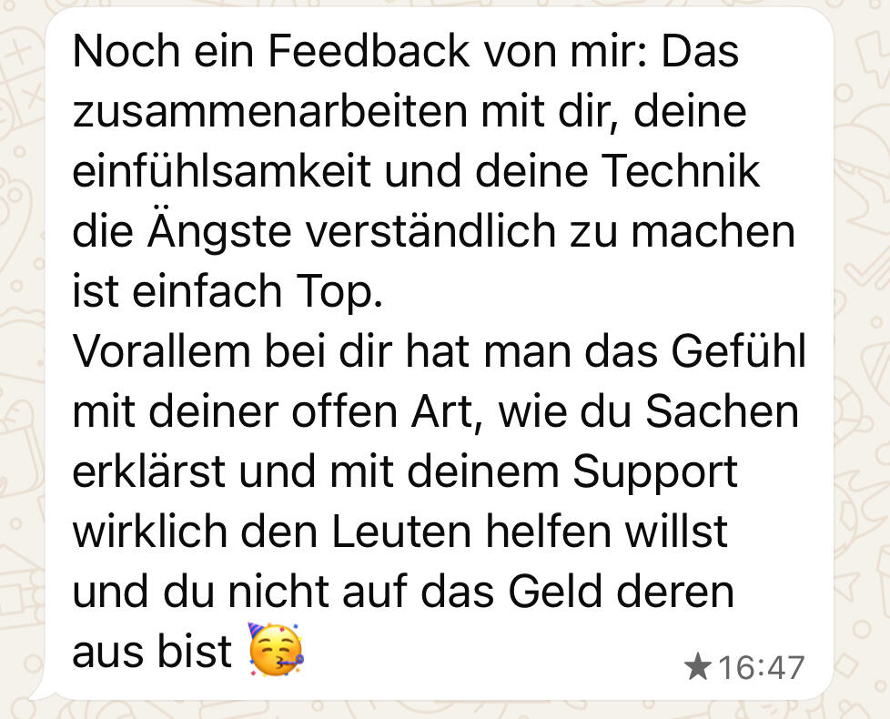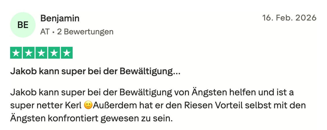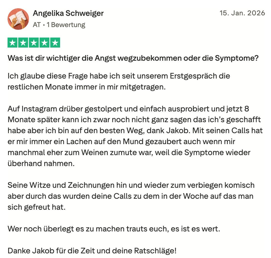 In einem Videocall schauen wir uns gemeinsam an, ob deine Ängste für dieses Programm geeignet sind. Wenn ja, stelle ich dir die Methode und mein Angebot im Detail vor.