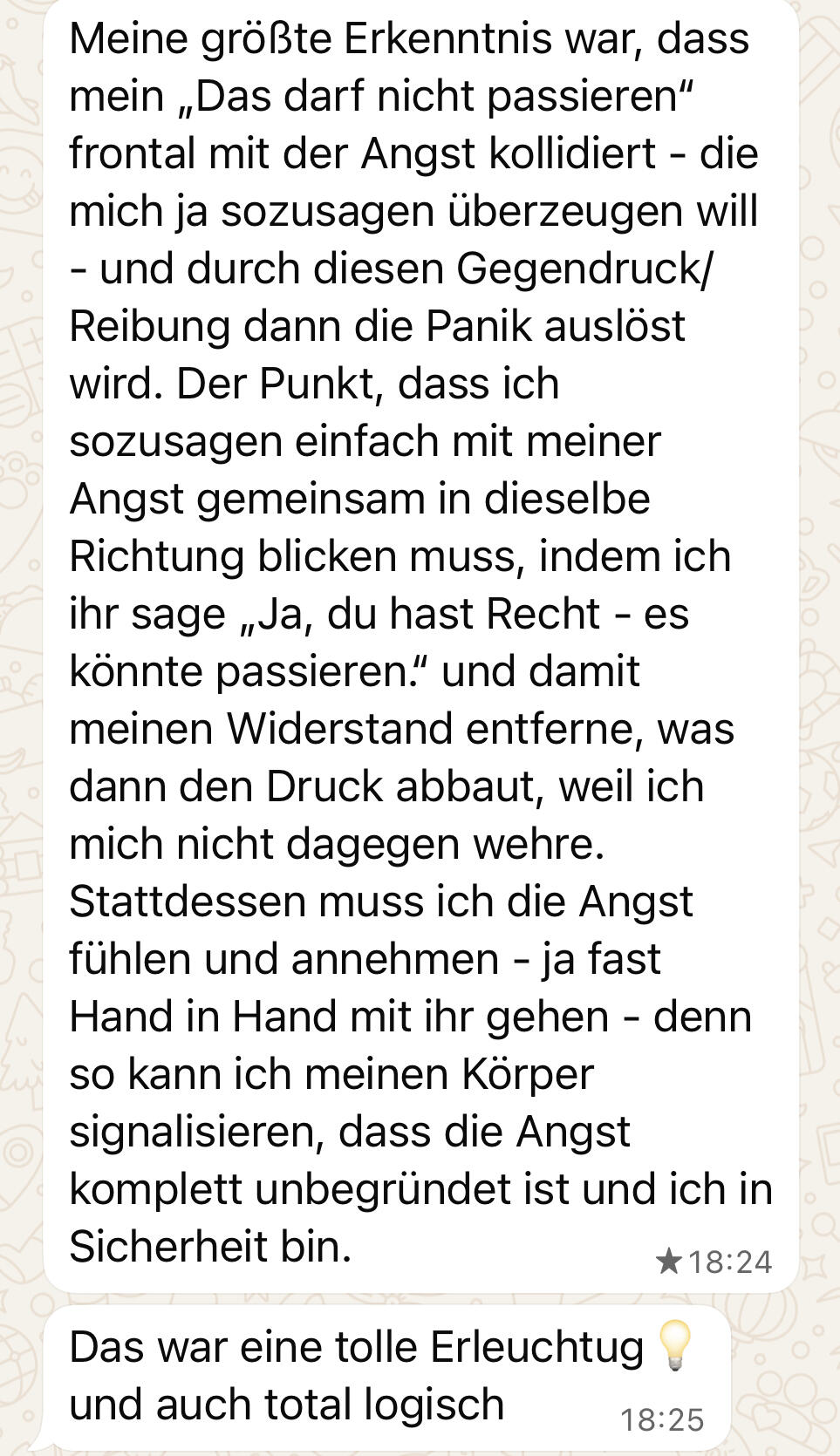 Viele sind überrascht, wenn sie diesen Schritt kennenlernen. Denn den meisten wird erst hier bewusst, wie viel sie täglich dafür tun, dass die Angst gar nicht verschwinden kann.